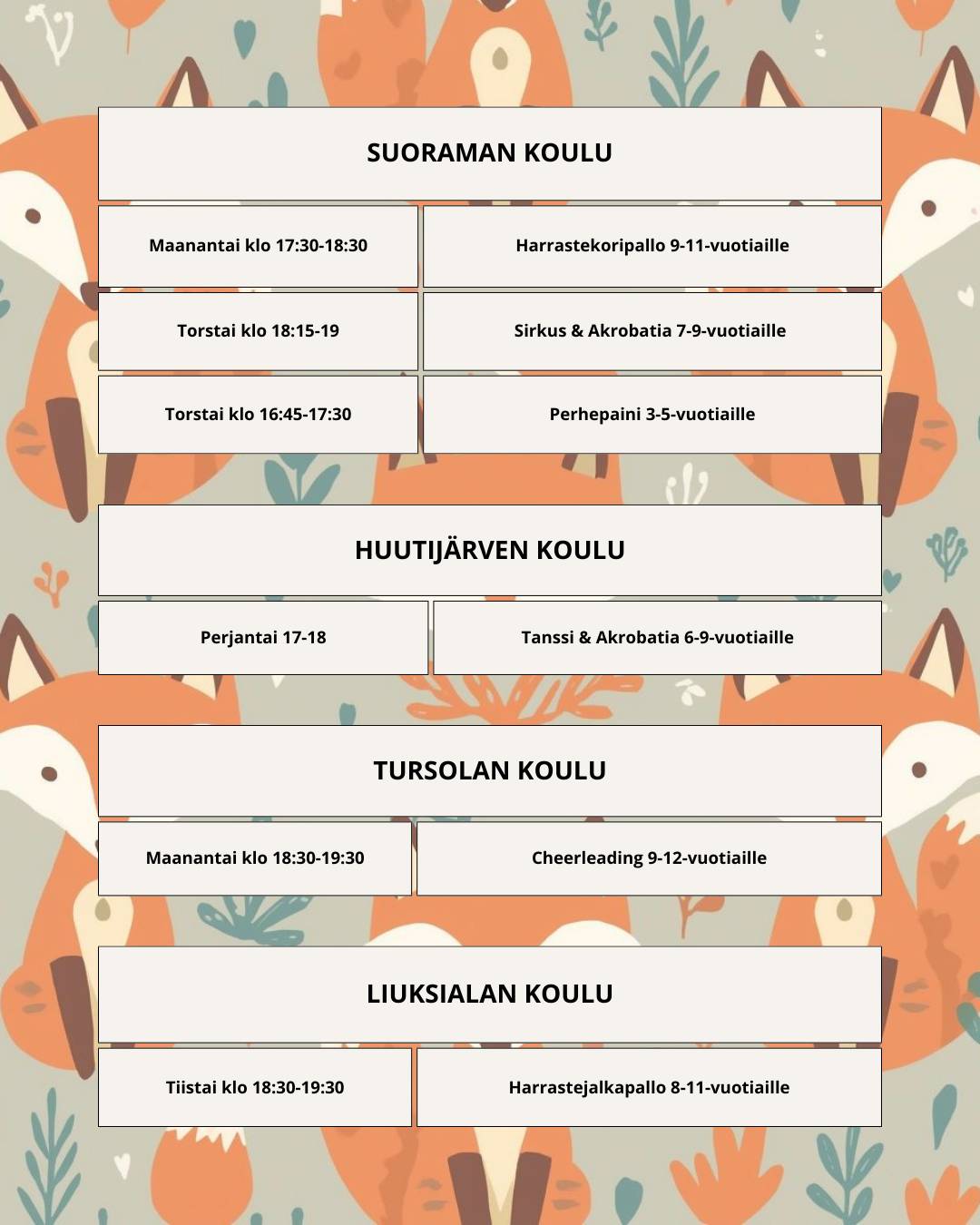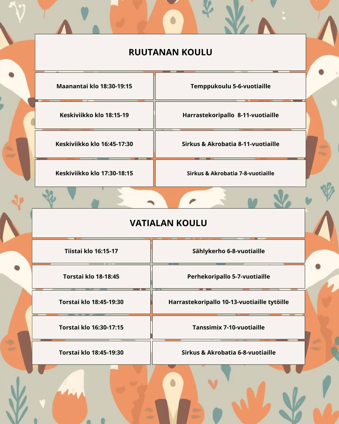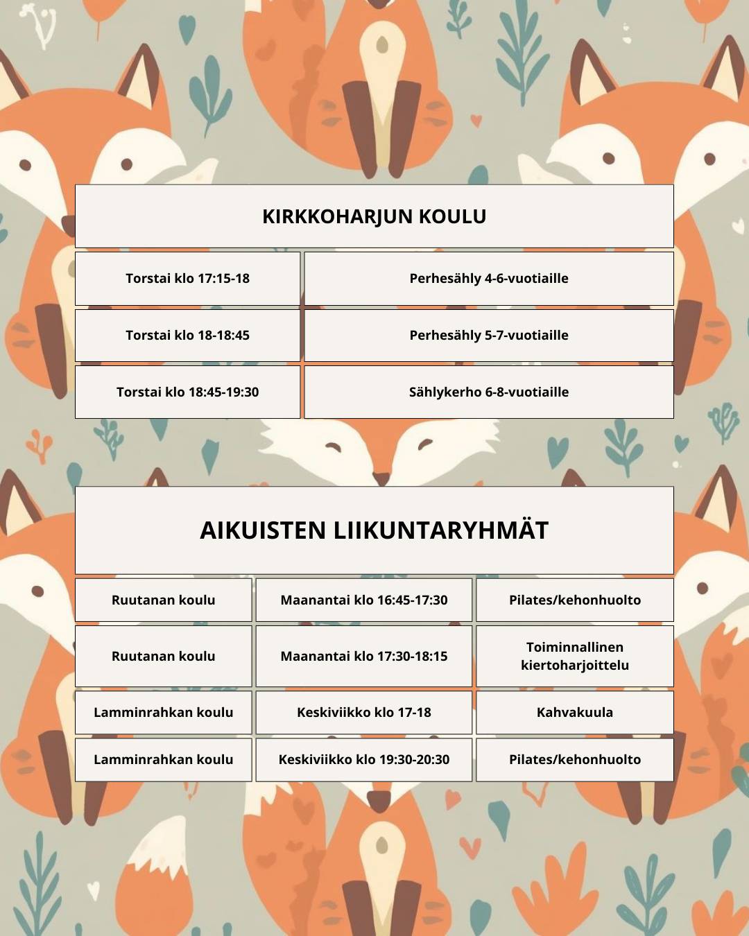 Kevätkausi alkaa suurimmalla osalla ryhmistä tällä viikolla. Moni kevään ryhmistä on jo täynnä, mutta vielä löytyy vapaita paikkoja eri ikäisille useista ryhmistä. Olemme lähettäneet infokirjeet harrasteliikuntaan osallistuneille.
