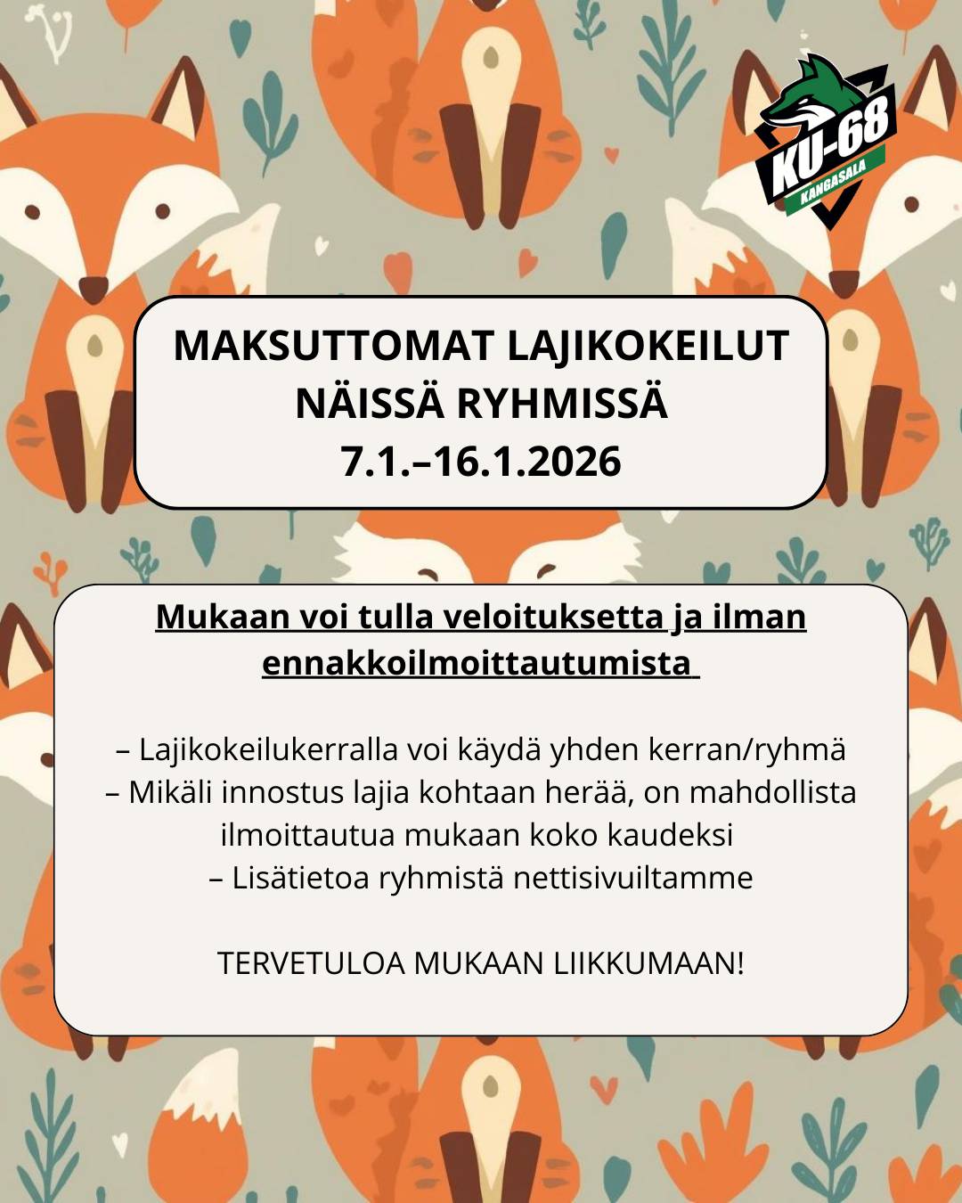 KU-68 tarjoaa valituissa ryhmissä ilmaisia lajikokeiluja viikoilla 2-3